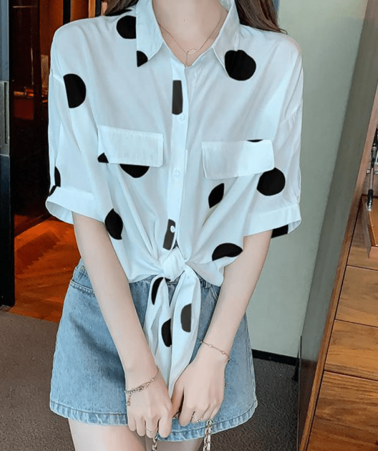 Notre chemise à pois pour femmes est conçue avec des manches courtes, idéales pour les journées chaudes ou pour ajouter une touche décontractée à votre tenue. Le motif à pois, toujours à la mode, ajoute une touche de fantaisie et de féminité. 🌼