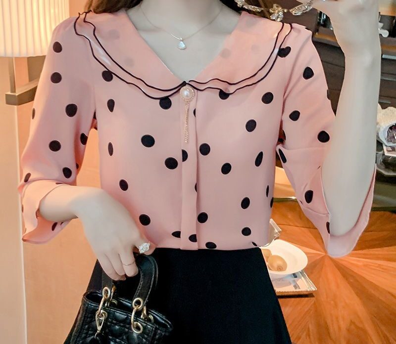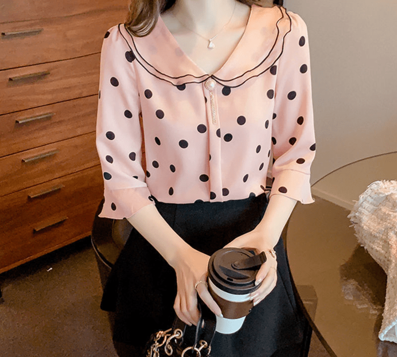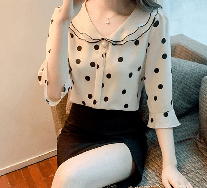 L’imprimé pois du chemisier apporte une touche rétro-chic très appréciée par les fashionistas modernes. C’est le motif idéal pour celles qui aiment jouer avec les styles et créer des looks originaux ! 💃 En effet, ce motif classique revient en force dans la nouvelle collection été 2023.
