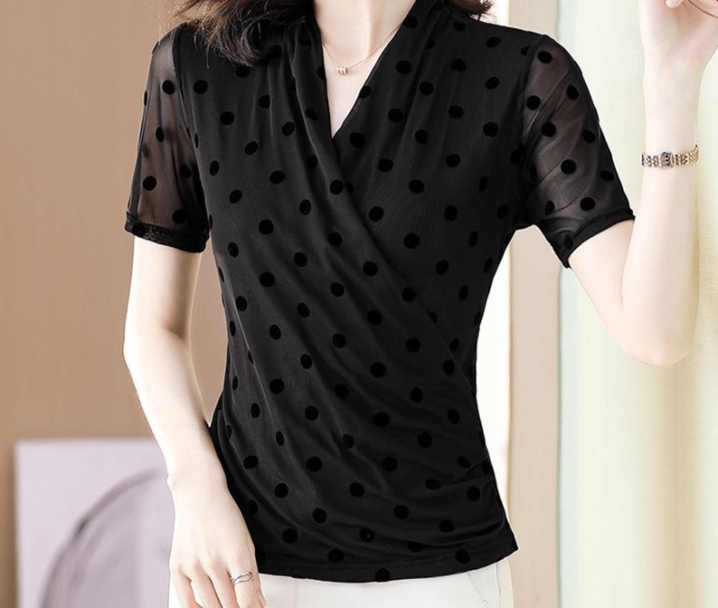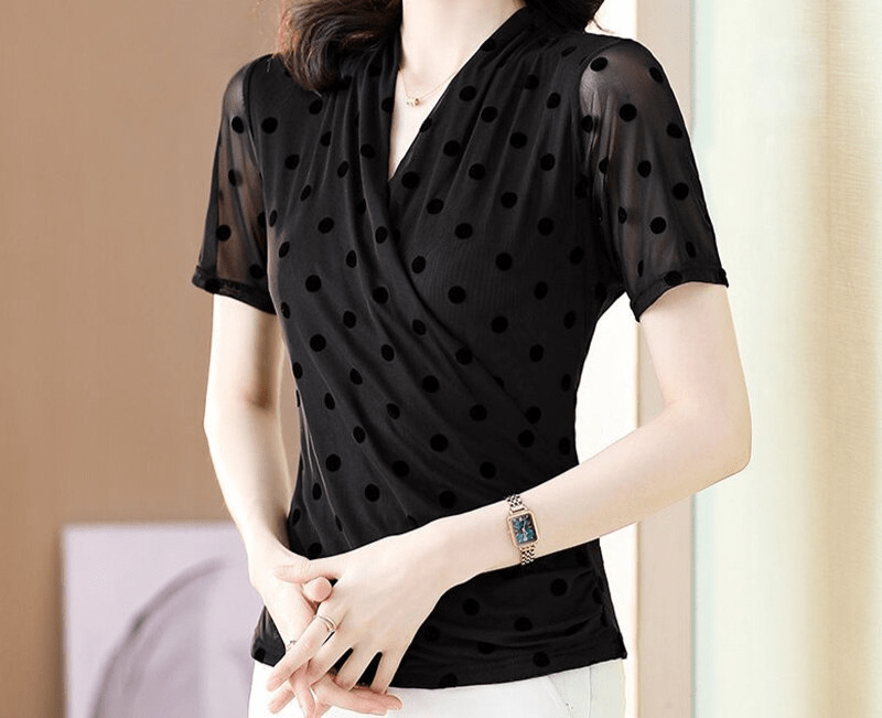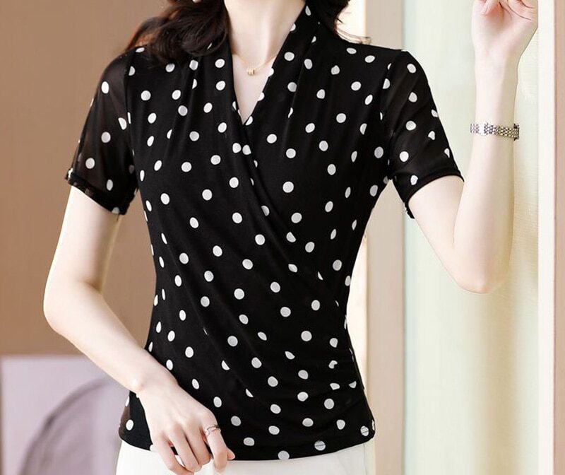 👗 Découvrez notre chemisier élégant à col en V, une pièce phare qui saura sublimer votre allure. Conçu spécialement pour les femmes modernes et sophistiquées, ce vêtement est l’incarnation même du chic décontracté. Son design intemporel avec son motif à pois lui confère une touche d’originalité tout en restant sobre et raffiné.