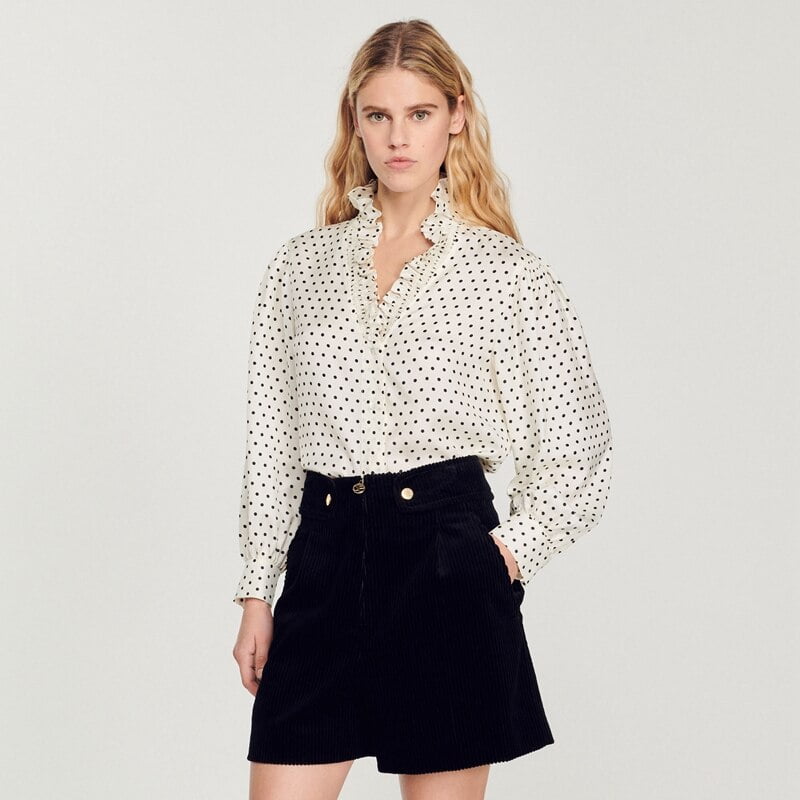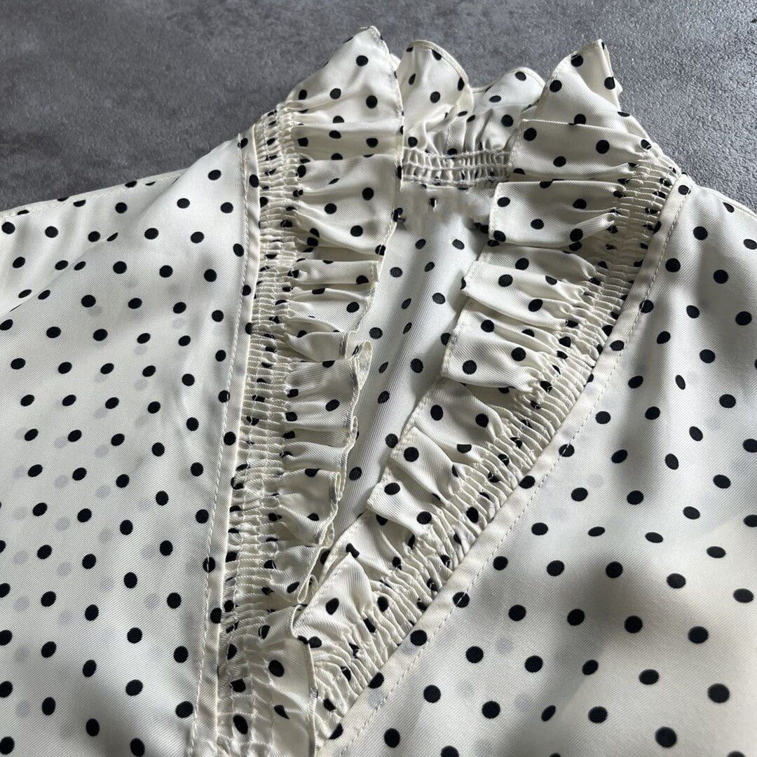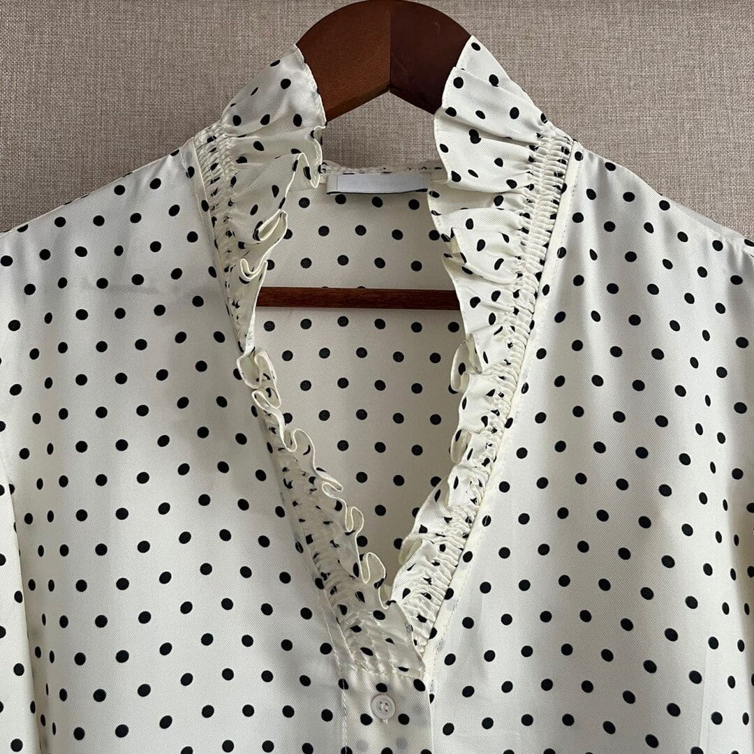 Ce chemisier se distingue par son design unique qui allie sophistication et confort. Fabriqué en tissu de haute qualité, il offre une sensation douce au toucher et assure un ajustement parfait. Les volants ajoutent une touche romantique tandis que l’imprimé à pois donne un look rétro-chic 🌟.