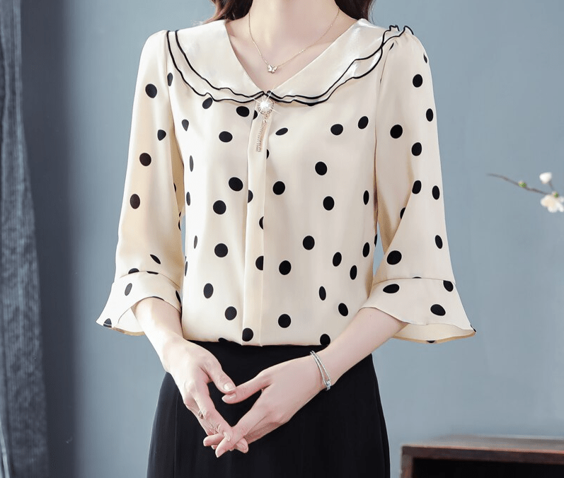 Notre chemisier est fabriqué en mousseline de haute qualité, un tissu léger et respirant qui vous assure un confort optimal tout au long de la journée. Les manches évasées ajoutent une touche de féminité et de style à votre tenue. Le motif à pois, quant à lui, est un classique indémodable qui apporte une touche de fantaisie à votre look. 😍