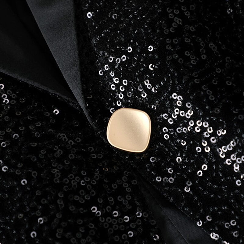 Son design unique avec des paillettes scintillantes et un bouton unique attirent tous les regards et ajoutent une touche de glamour à votre tenue. Le col cranté ajoute une note de sophistication, tandis que la coupe ajustée met en valeur votre silhouette avec élégance.