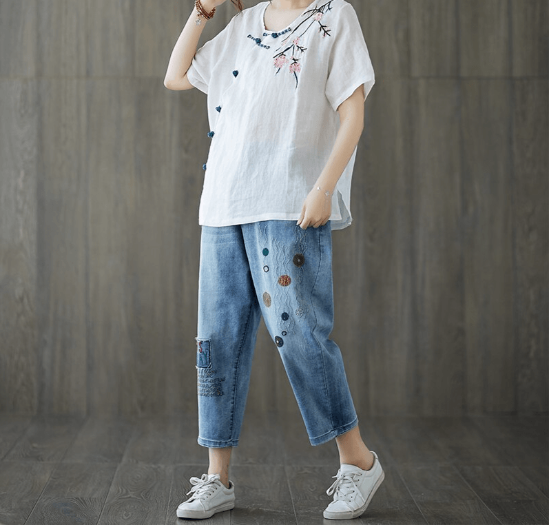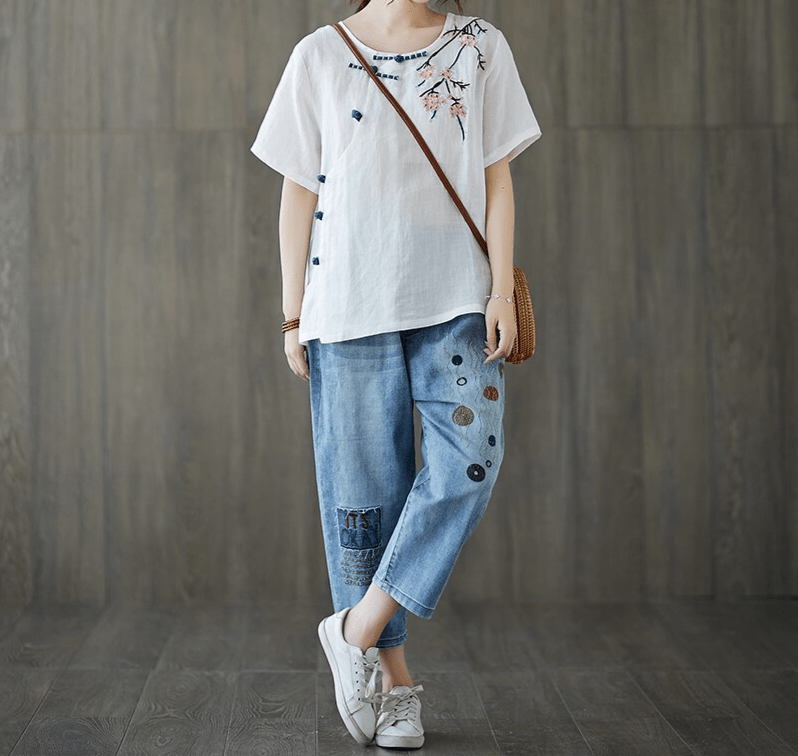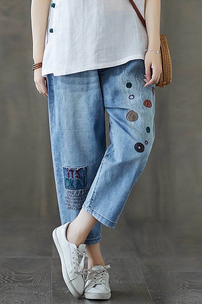 Grâce à sa coupe régulière, ce pantalon met en valeur votre silhouette tout en restant confortable.🌠 Les détails brodés et les patchs apportent une touche de sophistication et d’originalité à ce vêtement, ce qui en fait un choix unique pour les femmes à la recherche d’une pièce tendance et hors du commun.