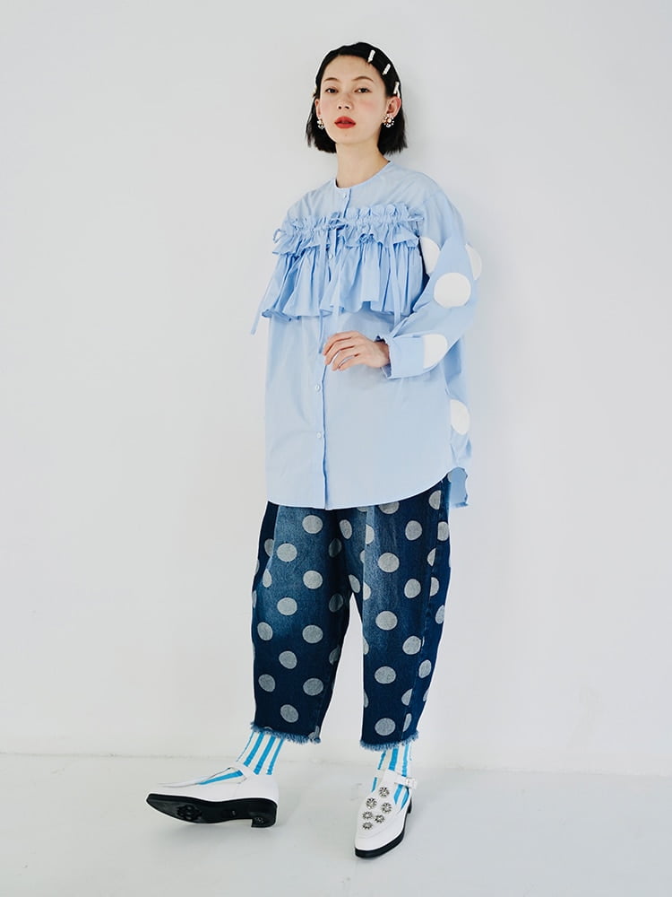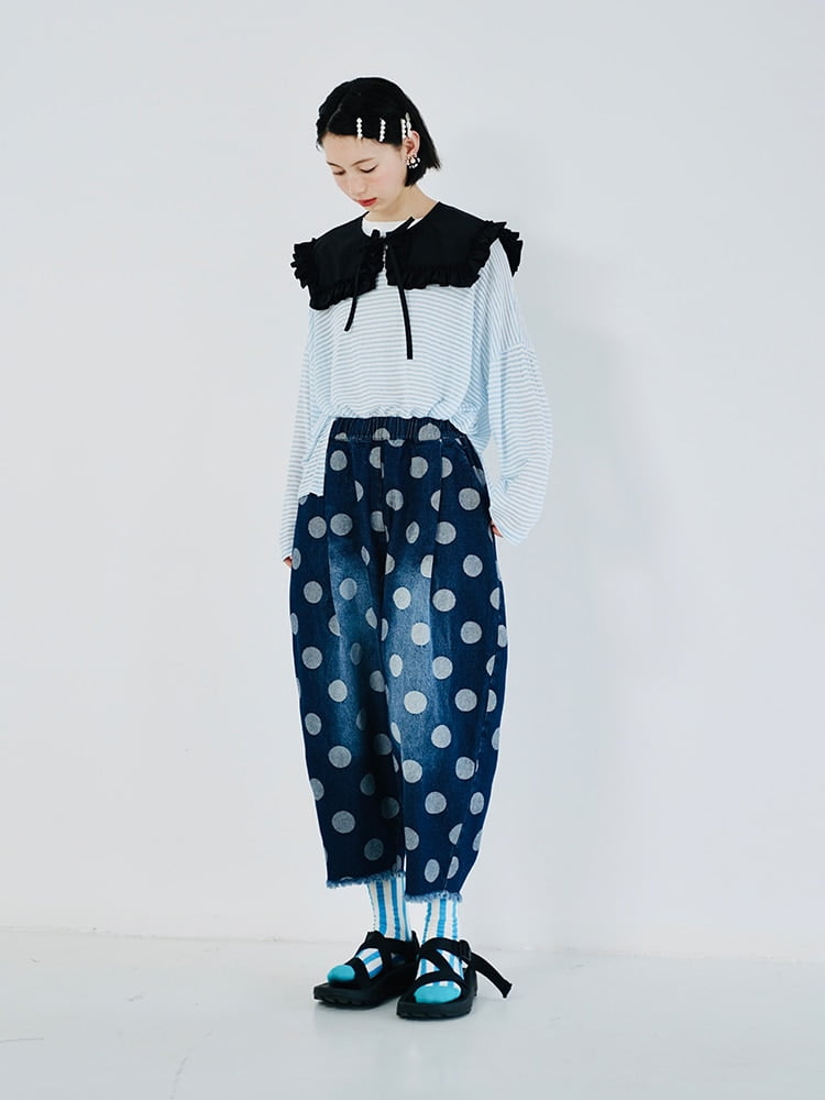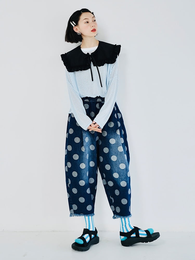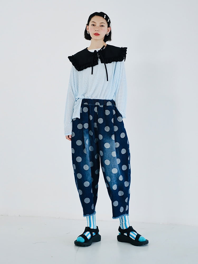Son tissu en denim imitation de haute qualité offre à la fois une élasticité moyenne et une excellente durabilité. Les plis décoratifs ajoutent une touche de sophistication, tandis que le motif à pois peint à la main apporte une touche d’originalité à votre tenue.