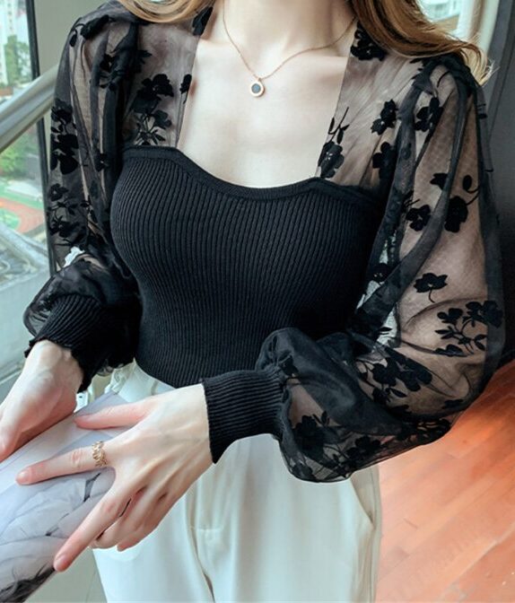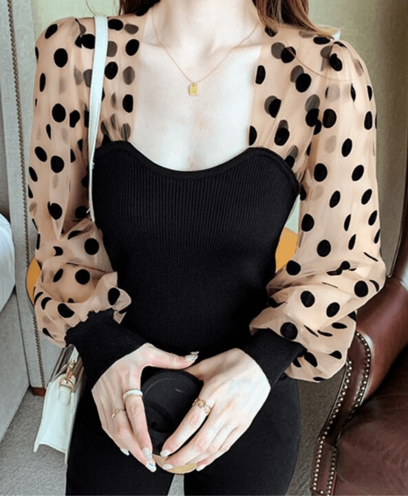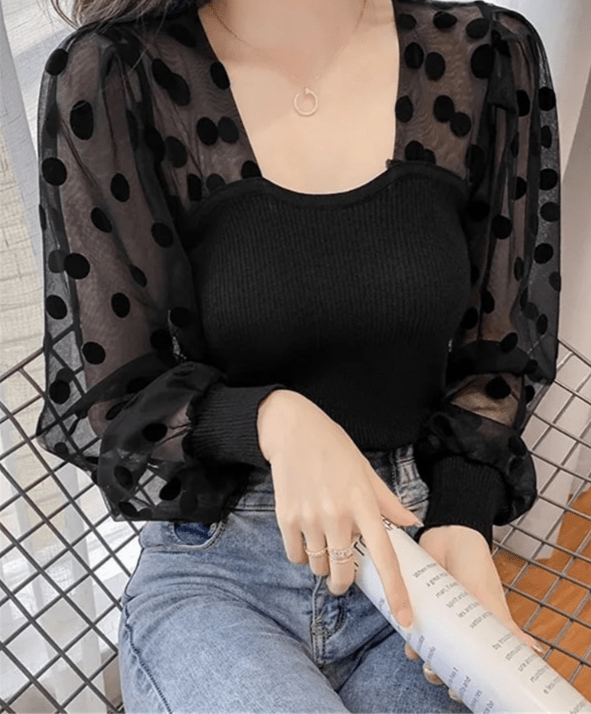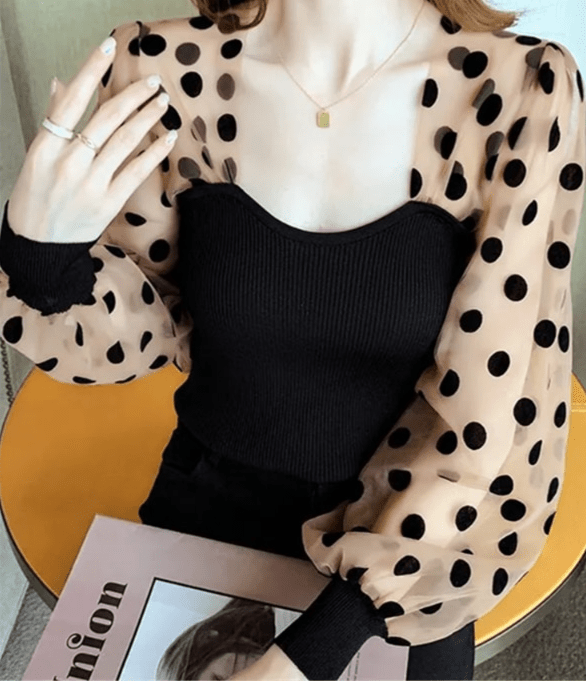 🎉 Découvrez notre T-shirt à manches longues pour femmes, un haut court chic qui allie élégance et originalité. Avec son patchwork de maille à pois, ce chemisier à bulles est une véritable pièce d’art vestimentaire. 🌟