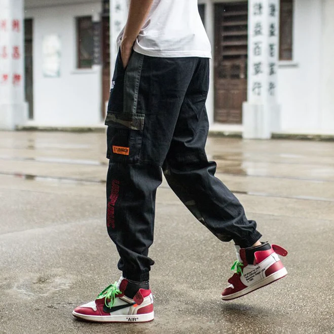 -Pantalon Jean Cargo Streetwear Noir Vert Treillis Militaire
