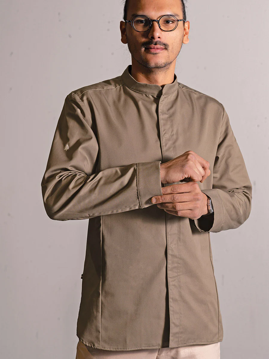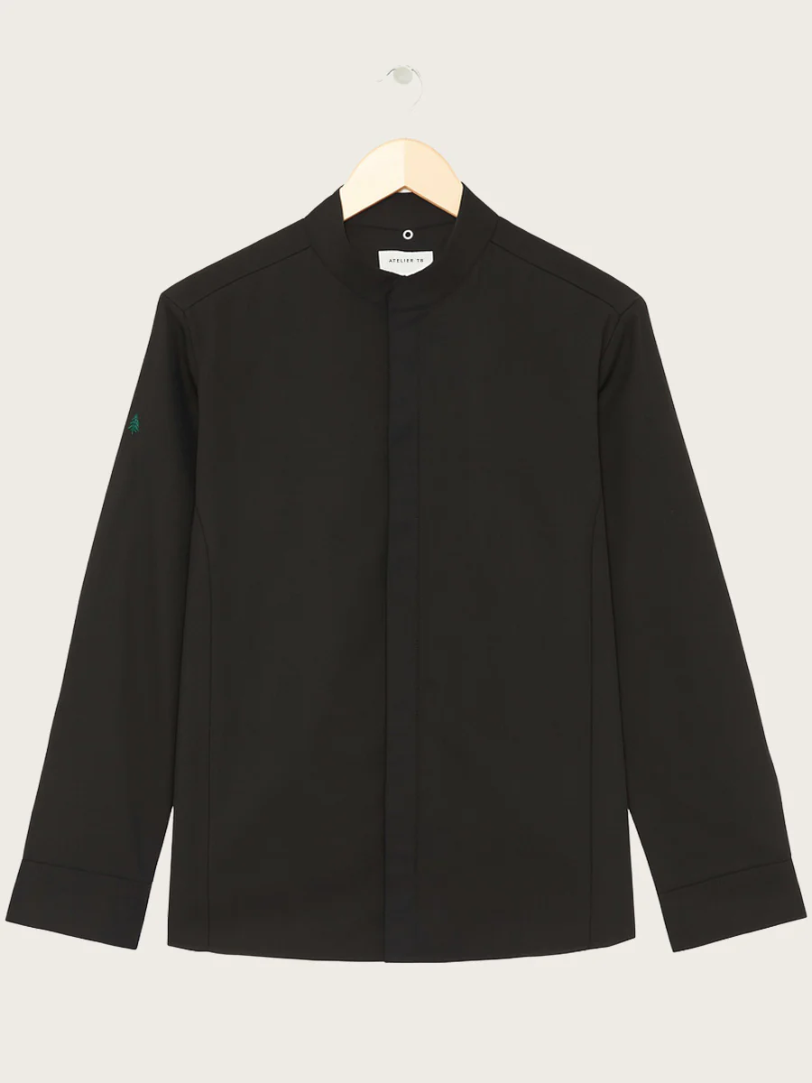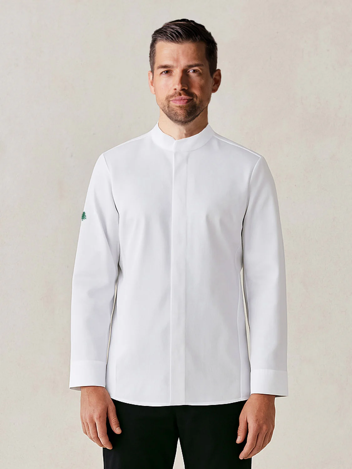 Veste de cuisine élégante et confortable pour homme avec col officier et boutonnage droit.