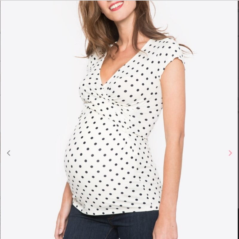 Avec son design élégant à pois et son col en V, il saura mettre en valeur vos nouvelles formes tout en restant discret lors des moments d’allaitement. Que vous soyez invitée à un mariage ou que vous cherchiez simplement un haut décontracté mais chic pour la saison estivale, ce T-shirt répondra parfaitement à vos attentes. 👗